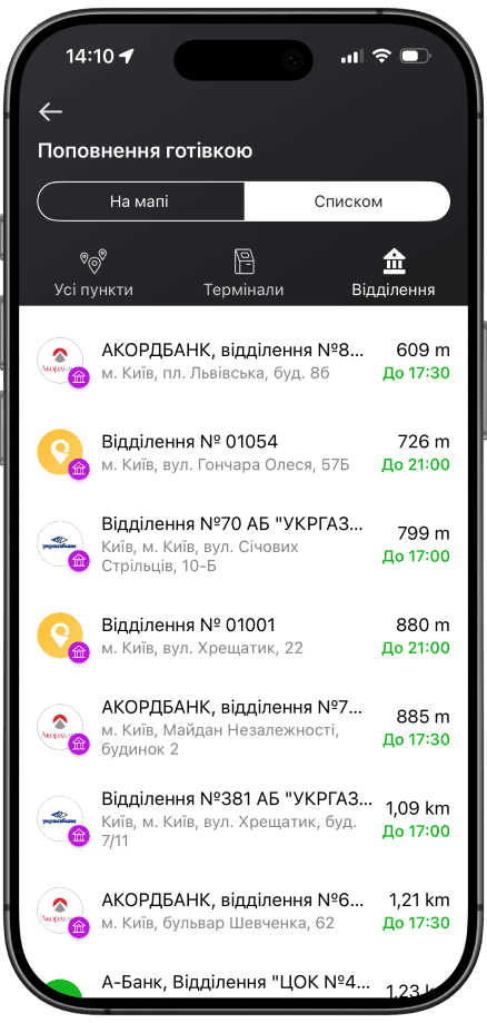 за зняття зарплати та ФОП-виплат в касах банків-партнерів (Універсал Банк, А-банк, Акордбанк та Укргазбанк)